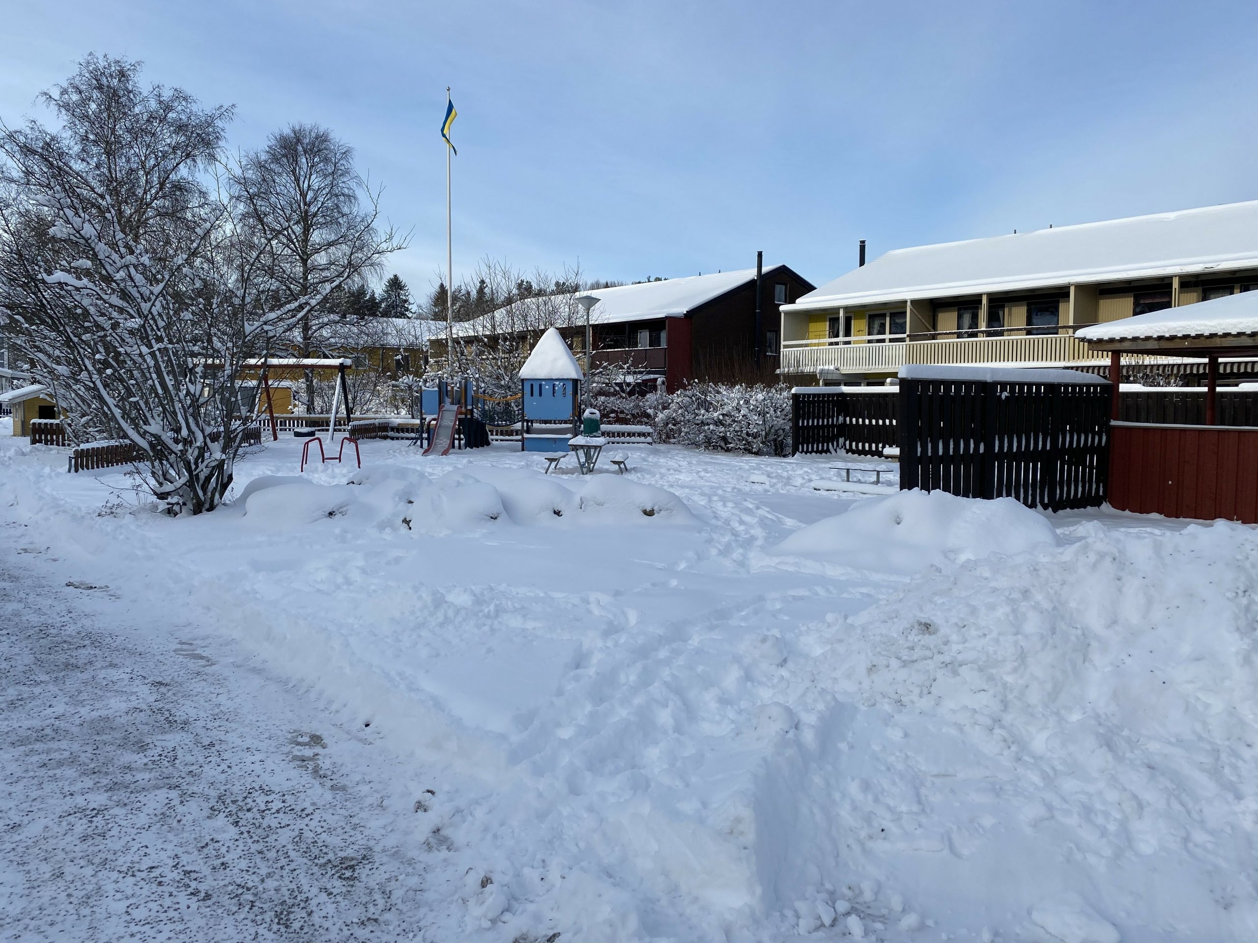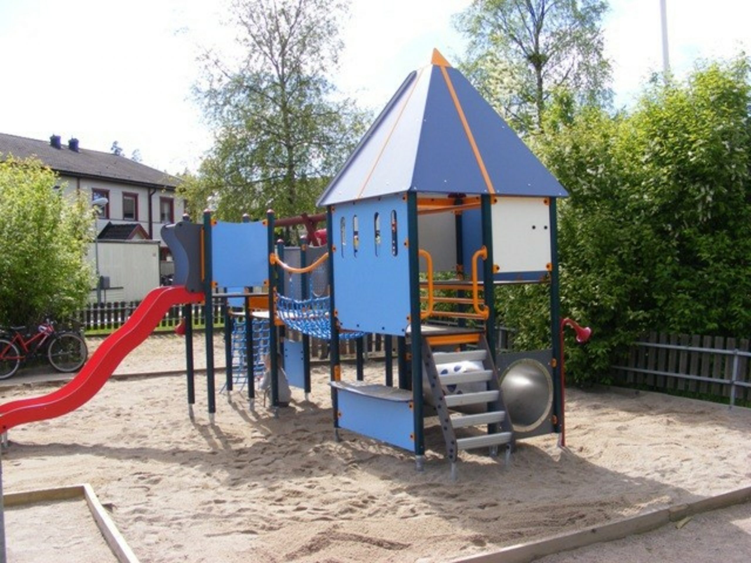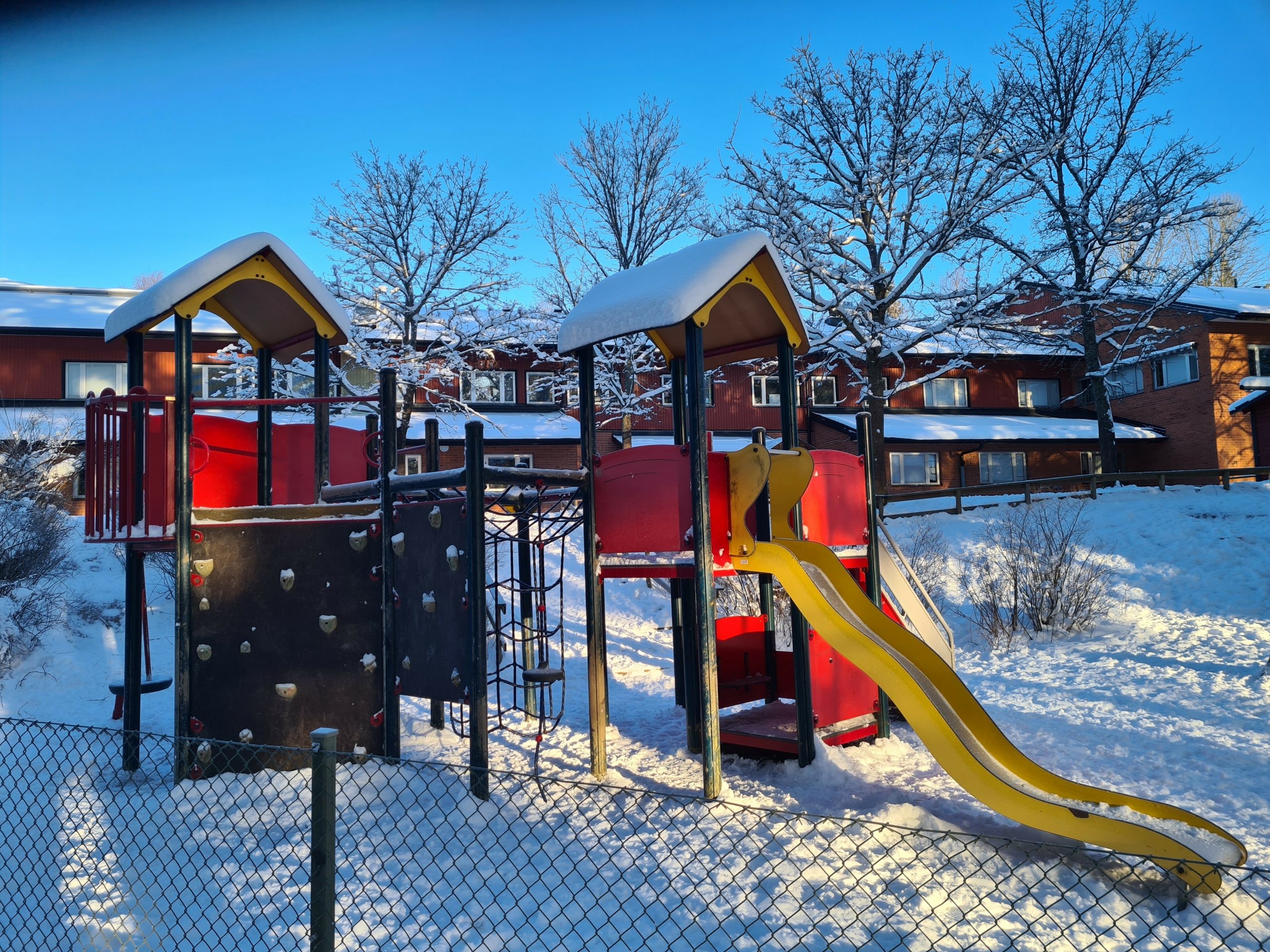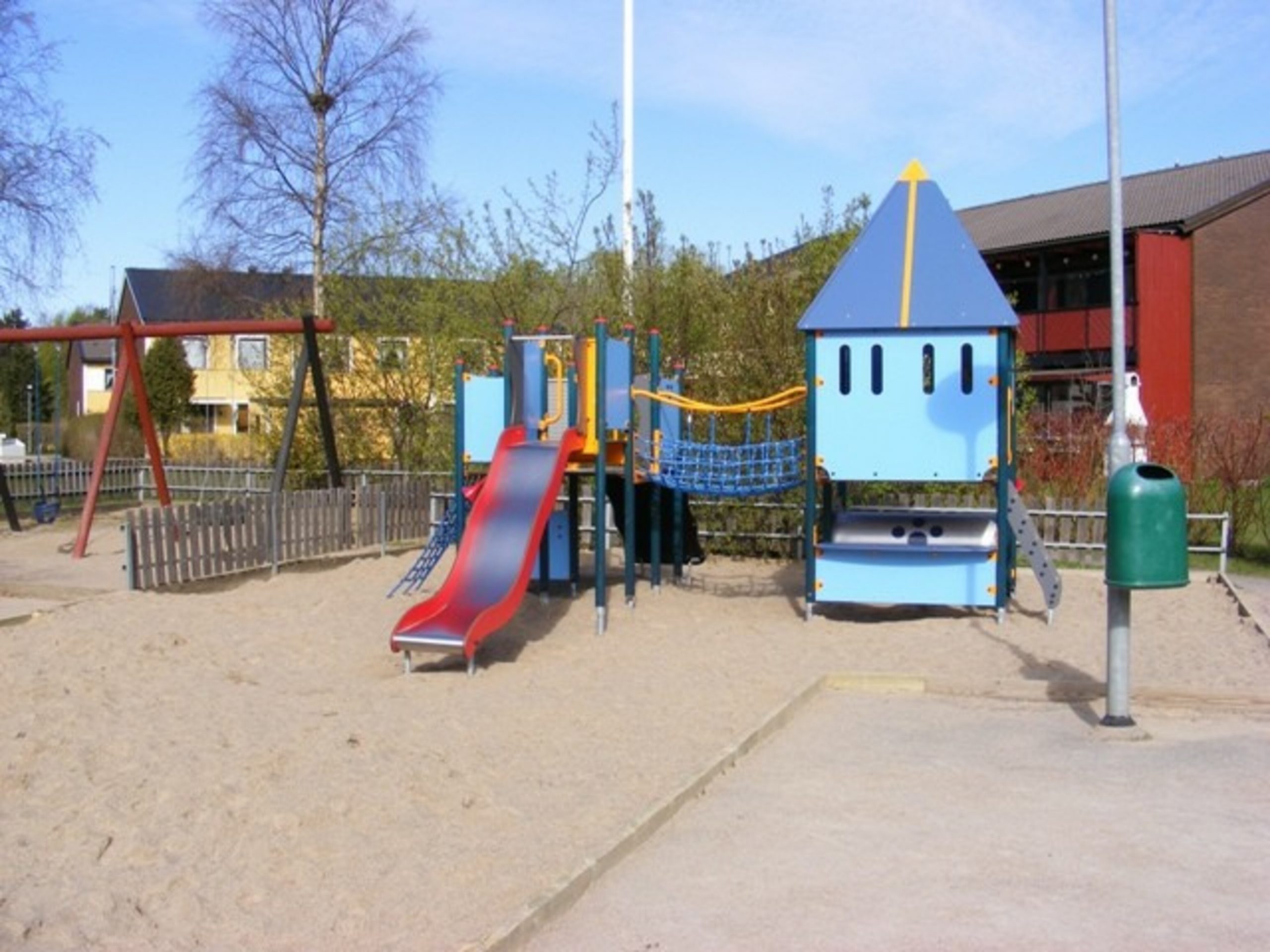 Lekplatser på området med redskap, fotbollsplan och basketkorg.
